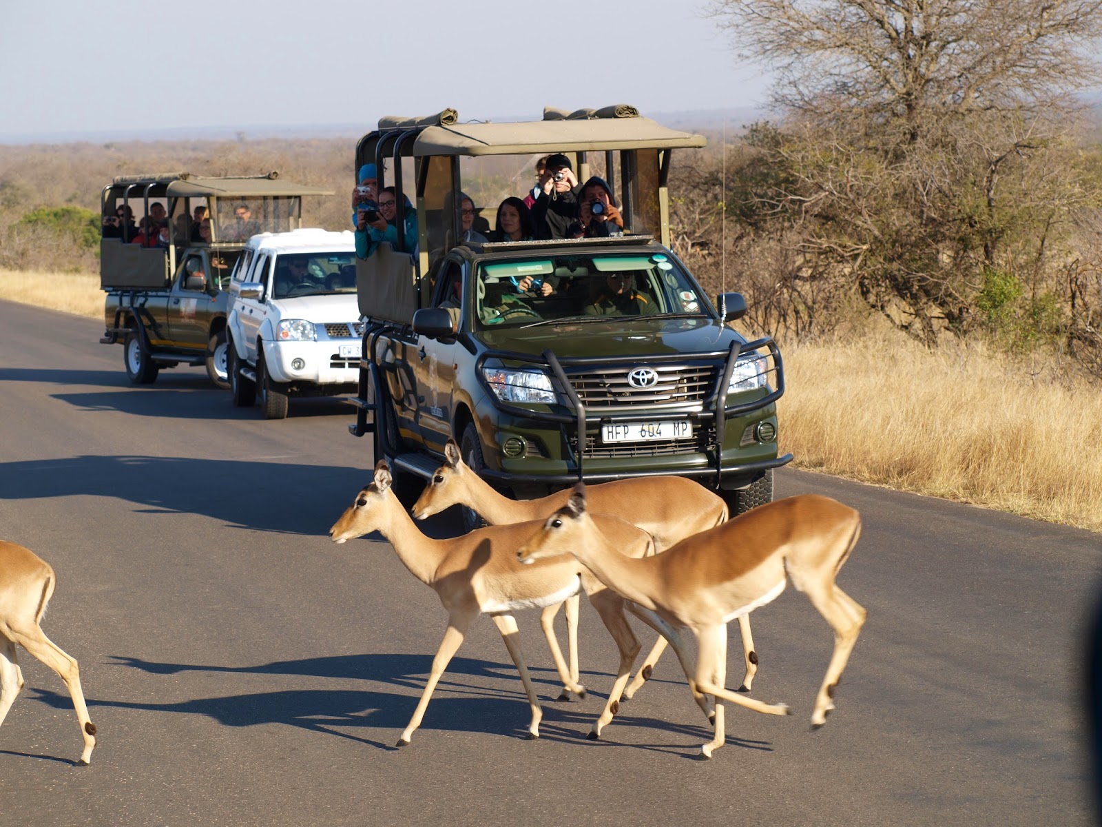 Richtig früh geht's heute los - um 6Uhr wird unsere Gruppe von insgesamt drei offenen Safari-Wagen abgeholt. Ziemlich kalt ist es außerdem noch, wird es aber nicht bleiben - der Zwiebel-Look wird sich als absolut nützlich erweisen. Nach circa einer halben Stunde erreichen wir über staubige Sandstraßen den Parkeingang - endlich in der afrikanischen Wildnis, eines meiner Highlights auf der Reise.